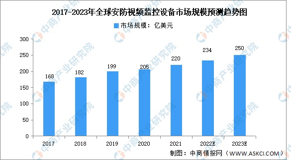 随着全球政治和经济的发展,社会和私人的安防意识和需求愈加强烈,叠加安防产业的迭代升级,全球安防监控行业进入快速上升周期。数据显示,2017-2021年,全球安防视频监控设备市场规模由2017年的168亿美元增长至2021年的220亿美元,复合年均增长率达7.0%。未来随着民众安全意识的加强及海外建设的逐步完善,预计2023年全球安防视频监控设备市场规模将达250亿美元。