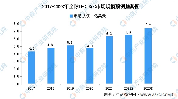 IPC SoC是安防监控前端设备中的重要组成部分。从视频监控系统进入网络化阶段以来,IPC成为了主流的前端设备,IPC SoC也成为了主流的前端设备视频监控芯片。数据显示,2020年,受国际贸易摩擦和新冠疫情影响,全球IPC SoC市场规模出现下滑。2021年全球IPC SoC市场环比改善,市场规模达6.3亿美元,预计2023年全球IPC SoC市场规模将达7.4亿美元。
