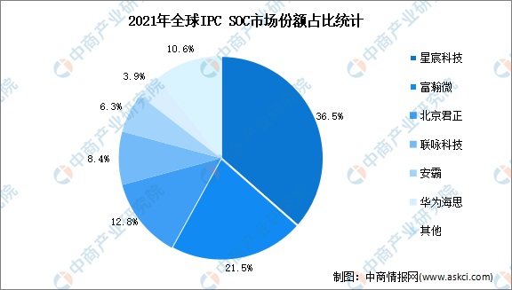 目前全球IPC SoC市场呈现高度集中状态,星宸科技、富瀚微、北京君正、联咏科技、安霸、华为海思等公司为IPC SoC市场的主要厂商。其中,星宸科技占据全球市场36.5%的市场份额,富瀚微、北京君正市场份额占比分别为21.5%、12.8%。