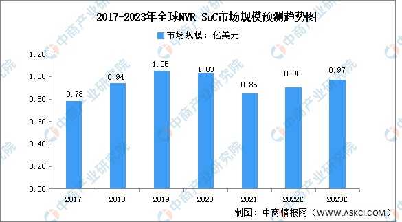 NVR SoC是安防监控后端设备中的重要组成部分。随着IP网络的快速发展,视频监控行业在全球范围内也逐渐进入了网络化/高清化时代,NVR将逐步实现对DVR的替代。数据显示,2021年全球NVR SoC市场规模达到0.85亿美元,在全球安防监控市场规模持续增长及行业智能化升级的趋势下,预计2023年全球NVR SoC市场规模将达0.97亿美元。