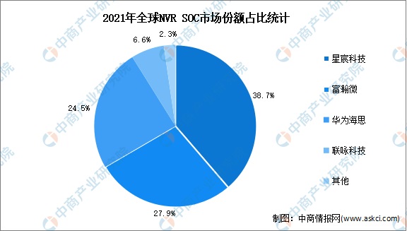 从全球NVR SoC市占率来看,星宸科技、富瀚微市场占有率较高,占比分别为38.7%、27.9%;其次,华为海思、联咏科技占比分别为24.5%、6.6。全球NVR SoC市场呈现高度集中状态。