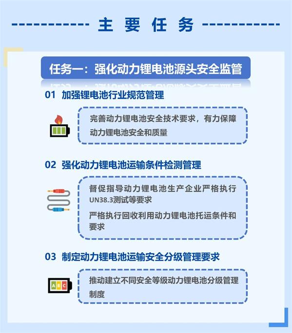 1.加强锂电池行业规范管理。加快修订《电动汽车用动力蓄电池安全要求》(GB 38031),完善动力锂电池安全技术要求,明确动力锂电池热失控安全性能指标和测试方法,提升动力锂电池本质安全水平。发布实施《锂离子电池行业规范条件(2024年本)》和《锂离子电池行业公告管理办法(2024年本)》,强化锂电池安全和质量管理相关要求。(工业和信息化部、市场监管总局按职责分工负责)