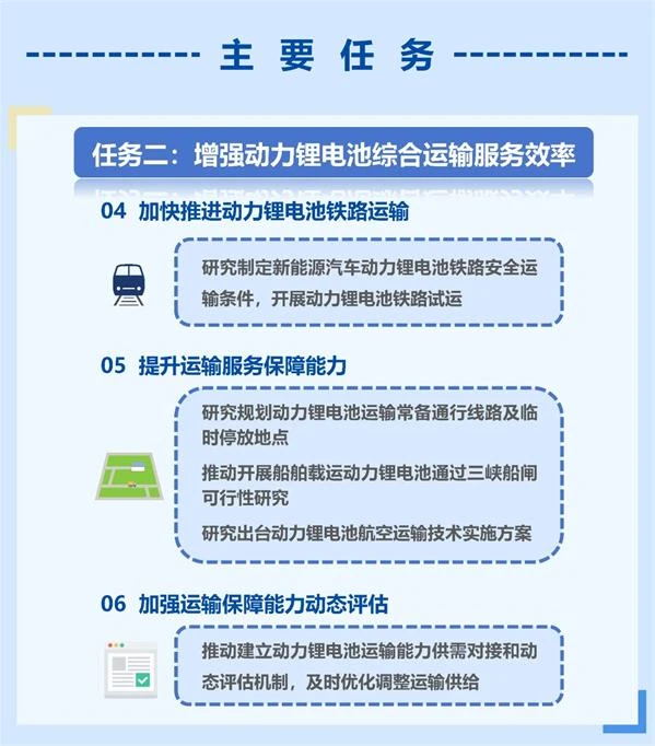5.提升运输服务保障能力。研究规划动力锂电池运输常备通行线路及临时停放地点,确保通行安全。优化船舶载运动力锂电池进出港申报手续,提升船舶进出港和货物周转效率。推动开展船舶载运动力锂电池通过三峡船闸可行性研究,研究推进动力锂电池先行通过“翻坝”转运,降低运输成本。研究出台动力锂电池航空运输技术实施方案,按照国际民航组织《危险物品安全航空运输技术细则》细化评估内容、优化操作程序、强化保障措施,进一步提升航空运输服务保障能力。(公安部、交通运输部、应急管理部、中国民航局按职责分工负责)