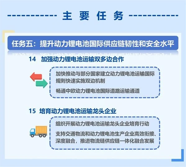 14.加强动力锂电池运输双多边合作。加快研究加入《危险货物国际道路运输公约》(ADR),加快推动与部分国家建立动力锂电池运输国际规则快速实施双边机制,畅通中欧动力锂电池国际道路运输通道。(交通运输部负责)
