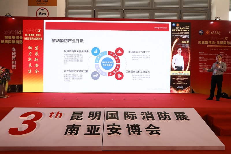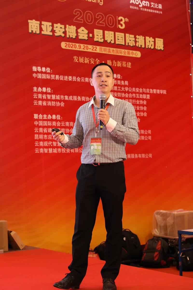 2020年9月20日上午10:00,在第三届中国(昆明)南亚安博会和第三届昆明国际消防展举办期间,由云南省智慧城市集成服务商协会、云南省消防协会联合主办,云南万隆会展服务有限公司承办的以“发展新安全 助力新基建”为主题的第三届中国(昆明)南亚智慧安全高峰论坛在昆明滇池国际会展中心隆重举办,云南克罗克代消防工程公司智慧消防荣誉顾问,辰安天泽智联技术有限公司西部大区销售总监陈宗侃在本届论坛上做了“新形势下的消防安全服务思考”主题分享。