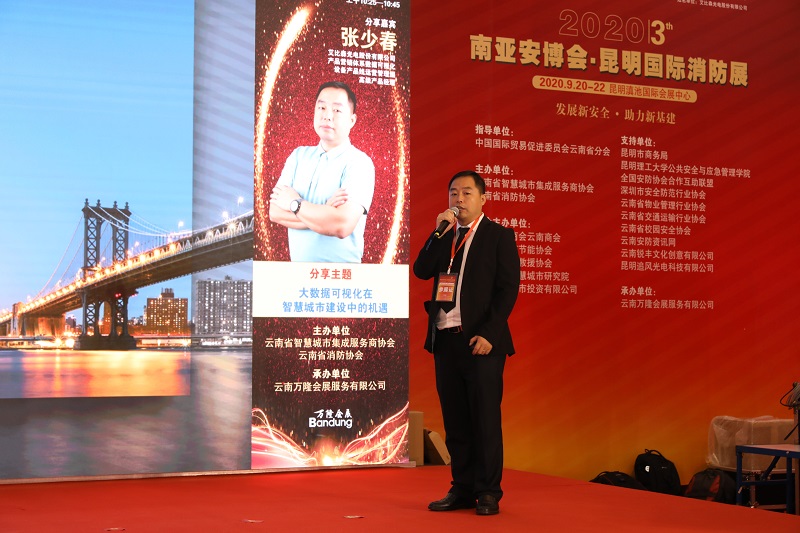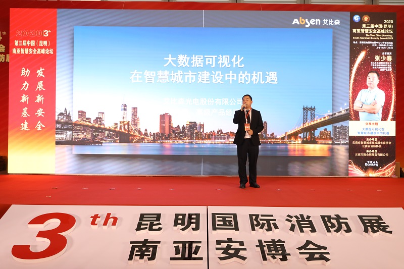 2020年9月20日上午10:00,在第三届中国(昆明)南亚安博会和第三届昆明国际消防展举办期间,由云南省智慧城市集成服务商协会、云南省消防协会联合主办,云南万隆会展服务有限公司承办的以“发展新安全 助力新基建”为主题的第三届中国(昆明)南亚智慧安全高峰论坛在昆明滇池国际会展中心隆重举办,艾比森光电股份有限公司受邀在本届论坛上做了“大数据可视化在智慧城市建设中的机遇”的主题分享。