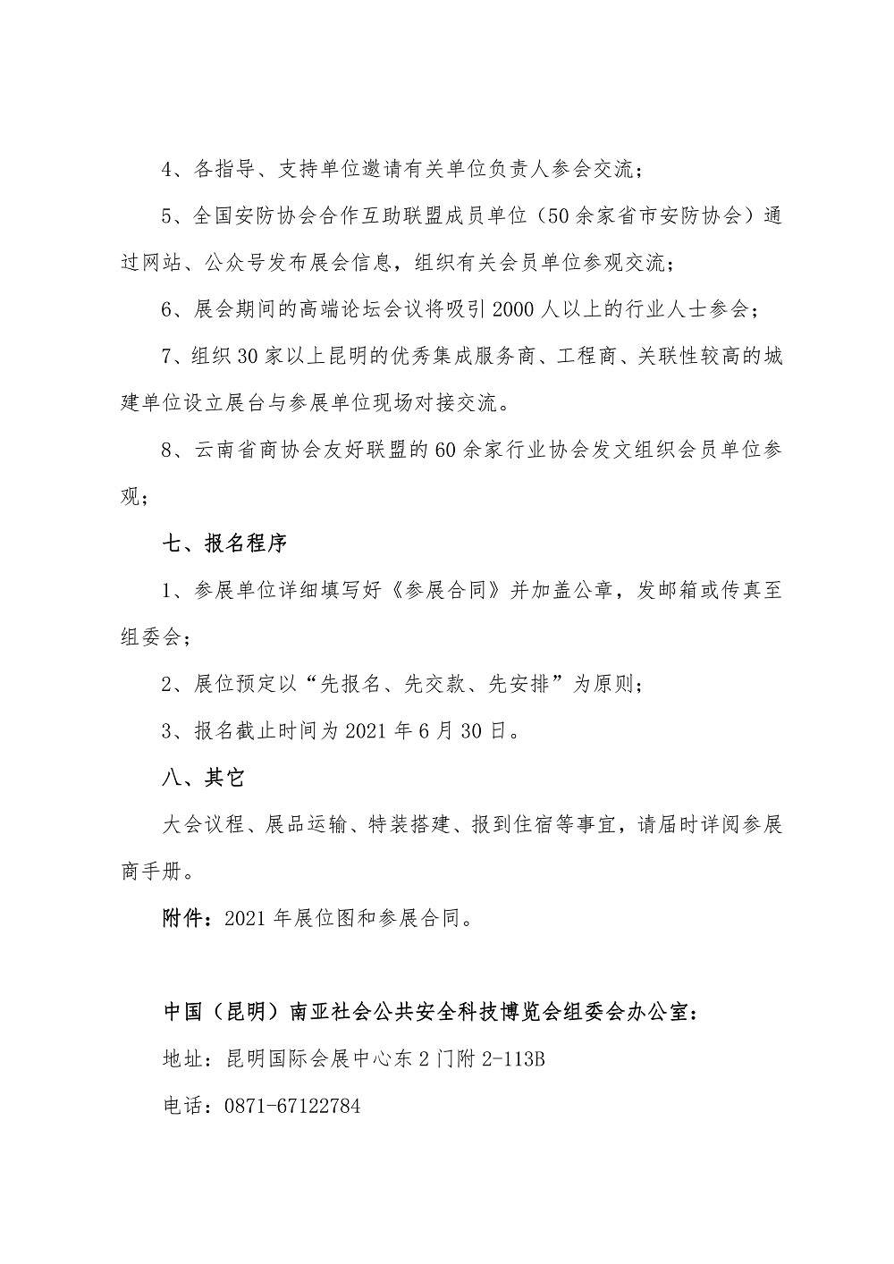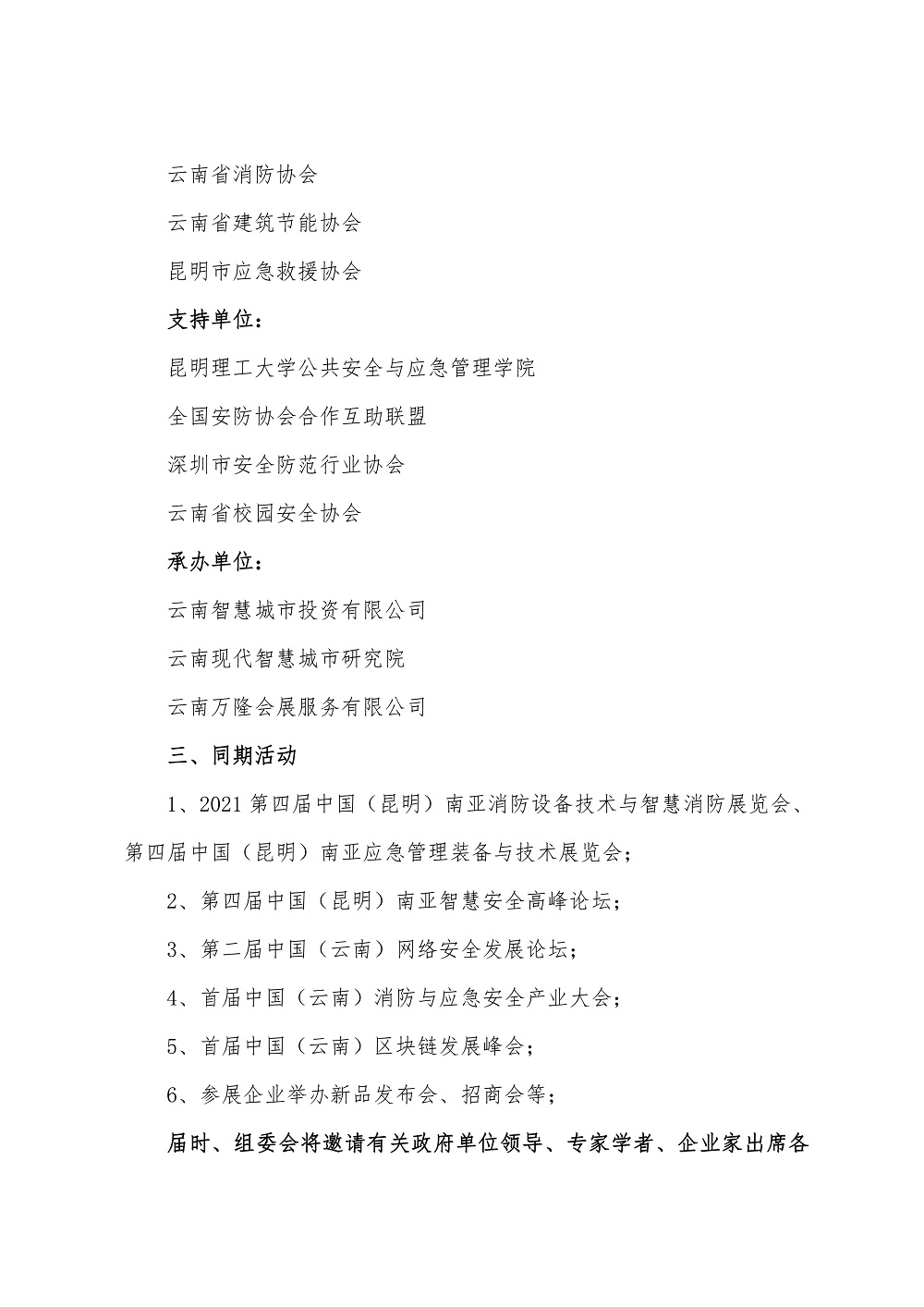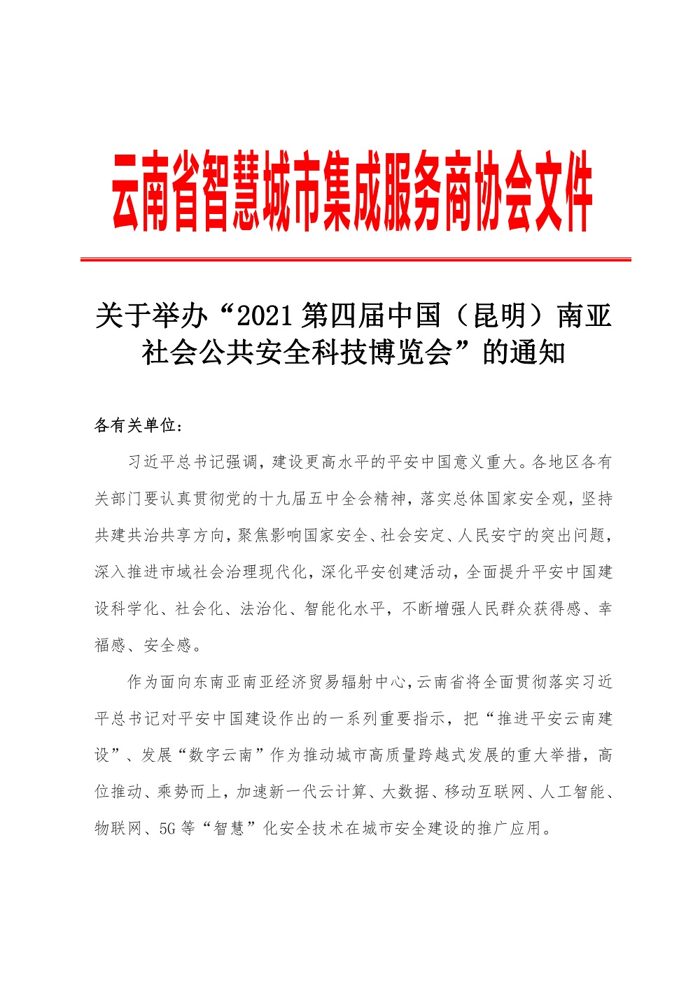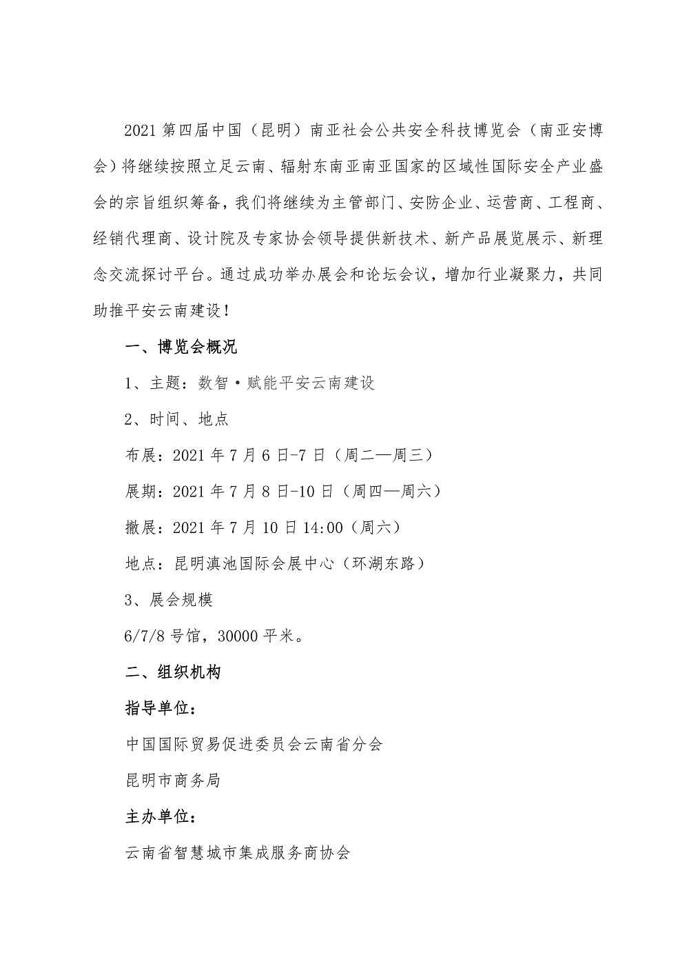 2021第四届中国(昆明)南亚社会公共安全科技博览会(南亚安博会)将继续按照立足云南、辐射东南亚南亚国家的区域性国际安全产业盛会的宗旨组织筹备,我们将继续为主管部门、安防企业、运营商、工程商、经销代理商、设计院及专家协会领导提供新技术、新产品展览展示、新理念交流探讨平台。通过成功举办展会和论坛会议,增加行业凝聚力,共同助推平安云南建设!