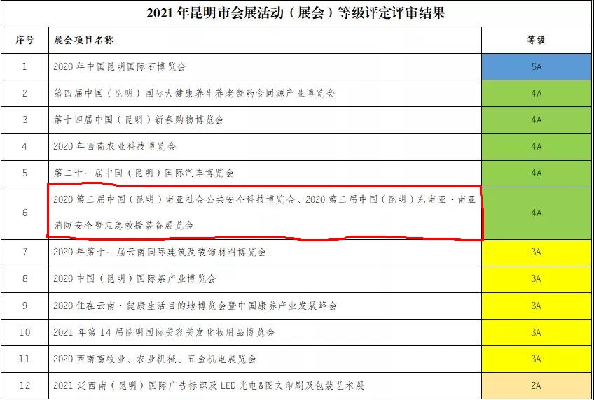 喜报!中国(昆明)南亚社会公共安全科技博览会被昆明市商务局评为4A级品牌展会。