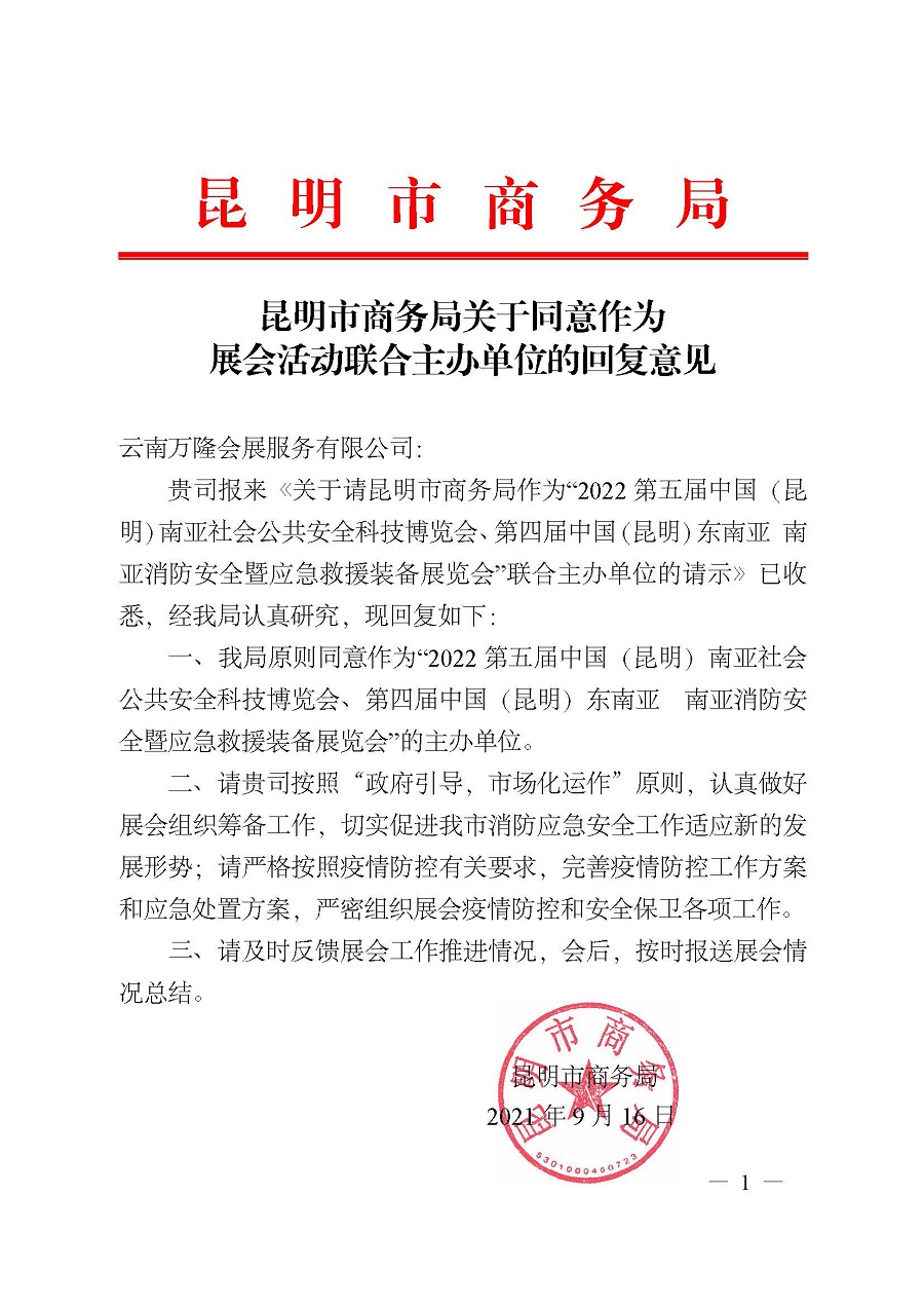 昆明市商务局关于同意作为“2022第五届中国(昆明)南亚社会公共安全科技博览会”联合主办单位的批复