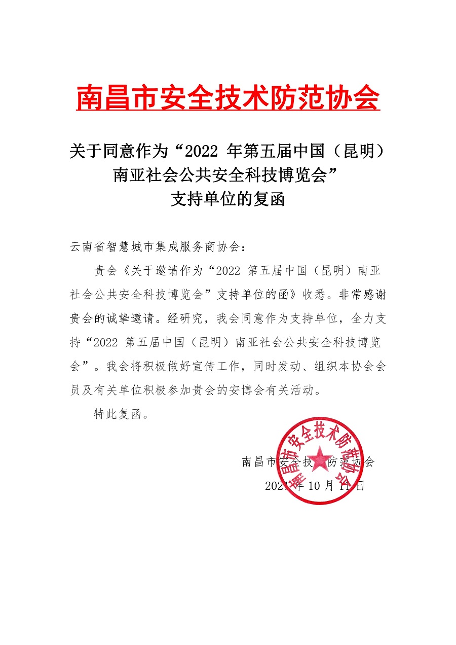 关于同意作为“2022年第五届中国(昆明)南亚社会公共安全科技博览会”支持单位的复函