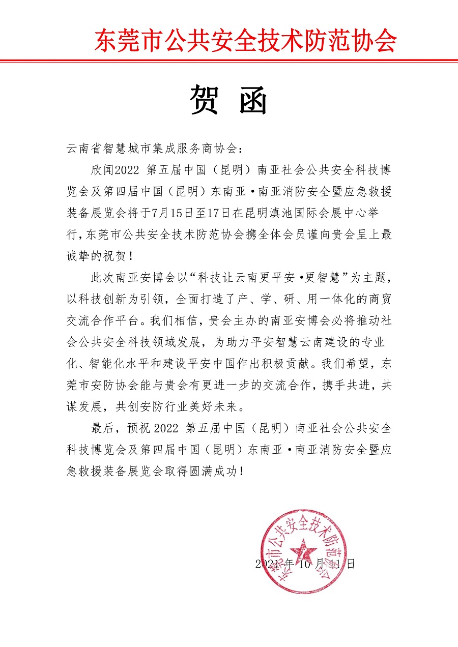 欣闻2022第五届中国(昆明)南亚社会公共安全科技博览会及第四届中国(昆明)东南亚·南亚消防安全暨应急救援装备展览会将于7月15日至17日在昆明滇池国际会展中心举行,东莞市公共安全技术防范协会携全体会员谨向贵会呈上最诚挚的祝贺!