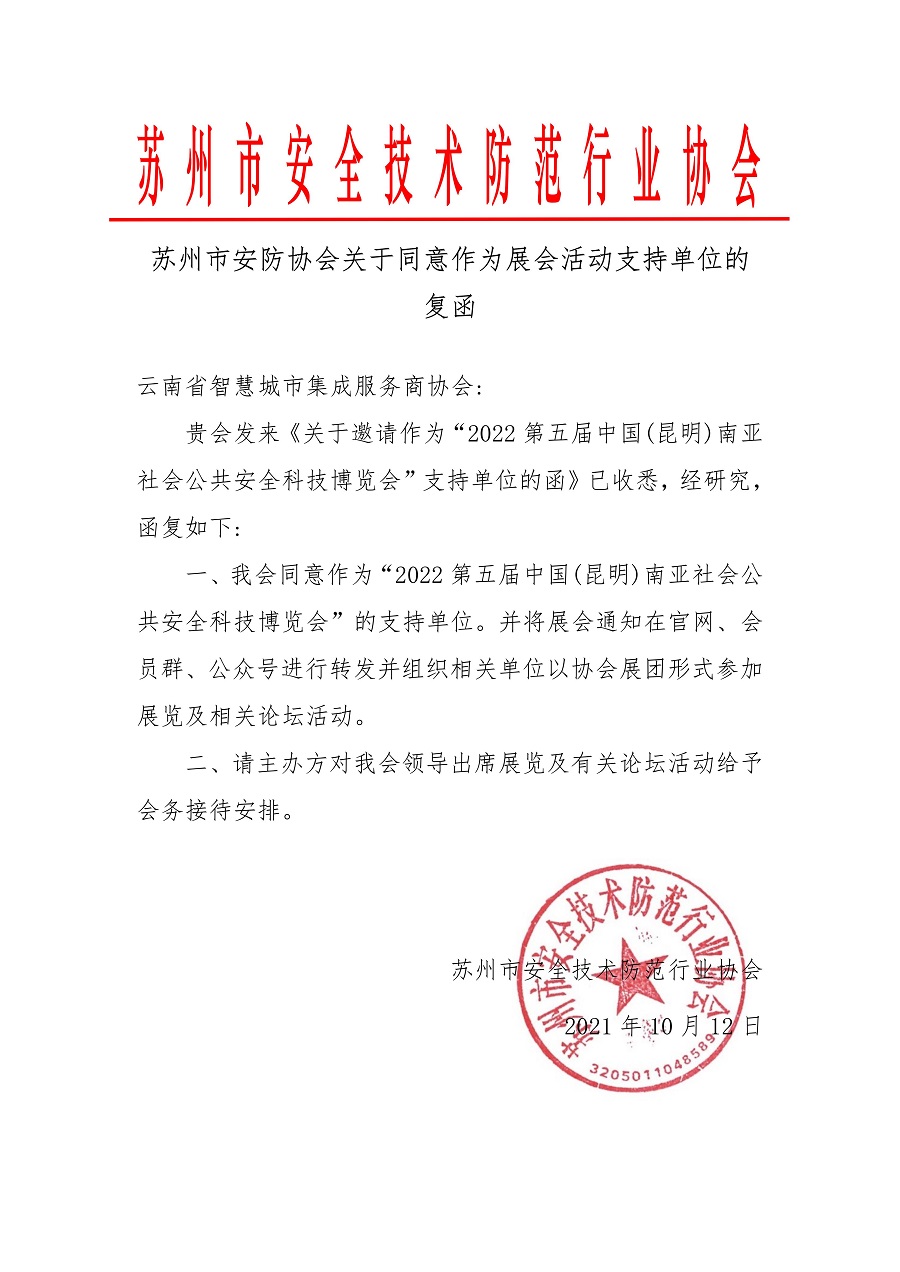 苏州市安防协会关于同意作为展会活动支持单位的复函