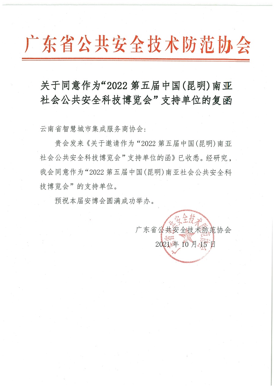 贵会发来《关于邀请作为“2022 第五届中国(昆明)南亚社会公共安全科技博览会”支持单位的函》已收悉。经研究,我会同意作为“2022第五届中国(昆明)南亚社会公共安全科技博览会”的支持单位。