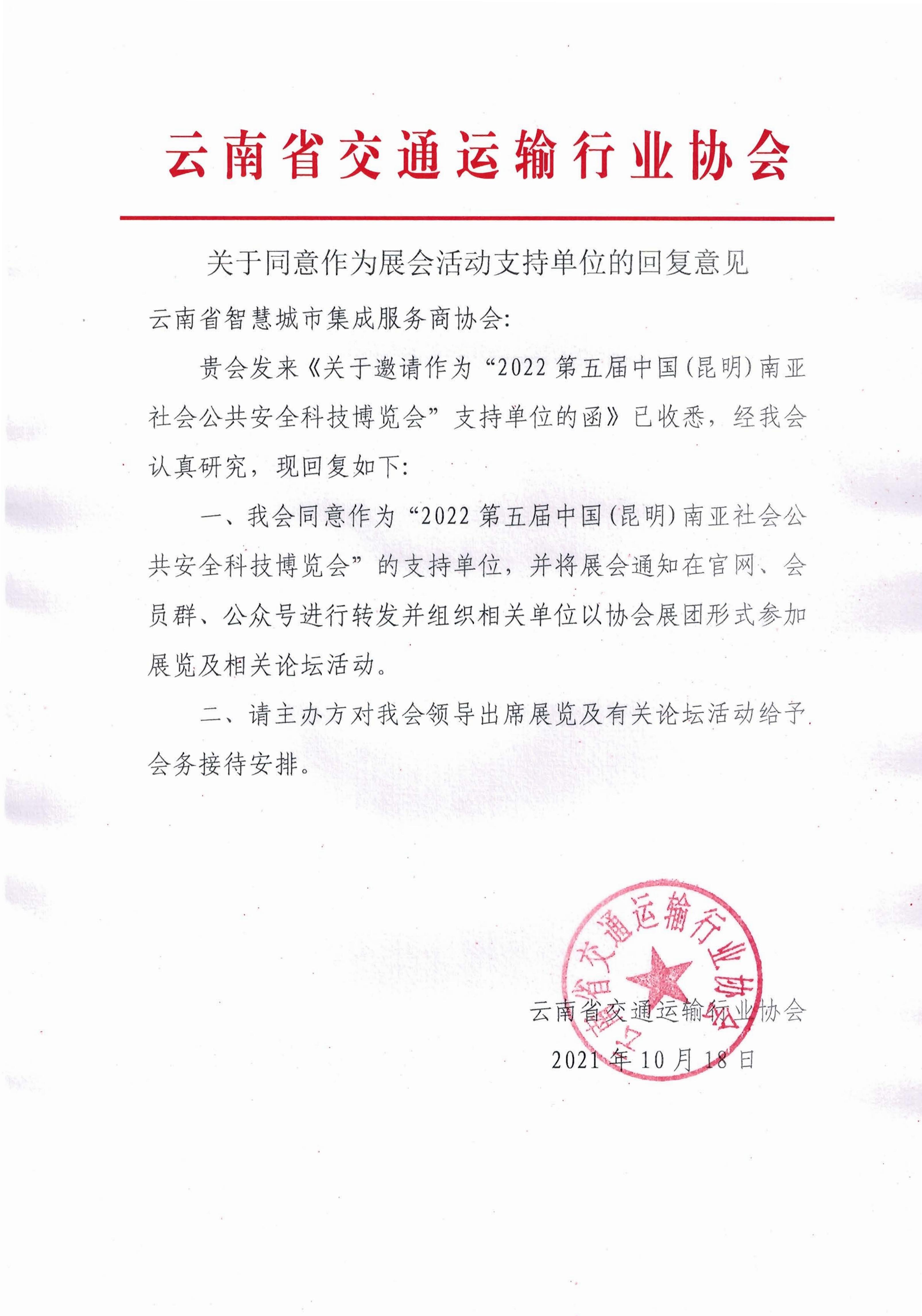 贵会发来《关于邀请作为“2022 第五届中国(昆明)南亚社会公共安全科技博览会”支持单位的函》已收悉,经我会认真研究,现回复如下: