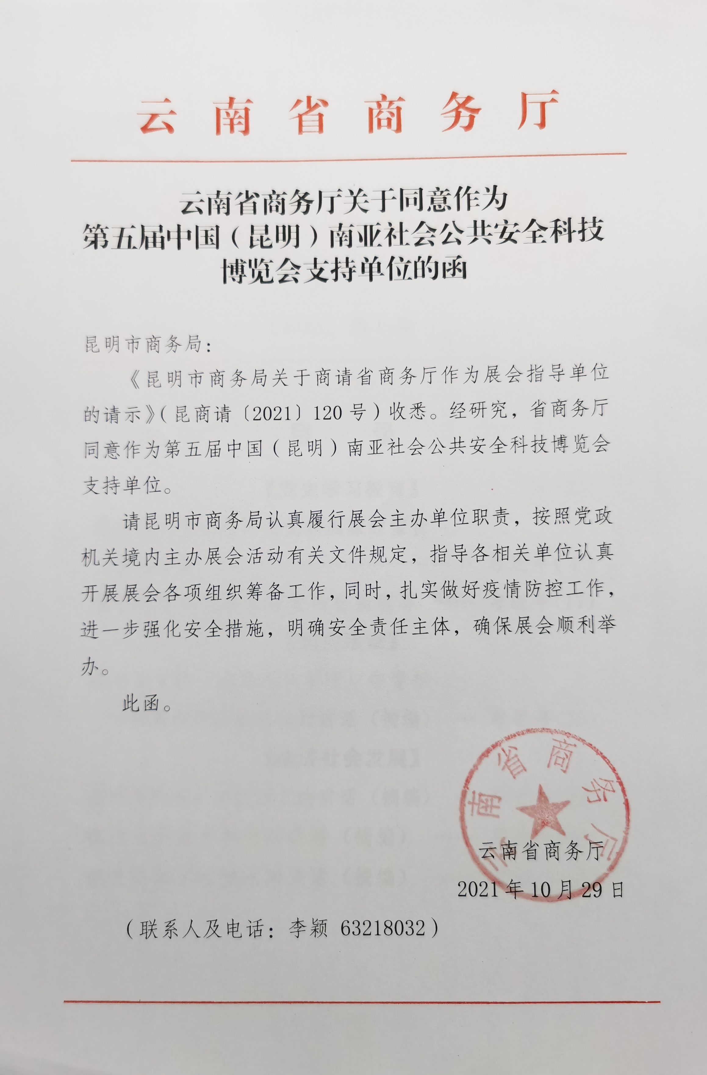 为筹办好2022第五届中国(昆明)南亚社会公共安全科技博览会(南亚安博会),昆明市商务局积极争取上级主管部门的支持,《昆明市商务局商请省商务厅作为本届南亚安博会的指导单位,(昆商请(2021)120号)》,日前,经省商务厅研究复函同意作为第五届中国(昆明)南亚社会公共安全科技博览会支持单位。