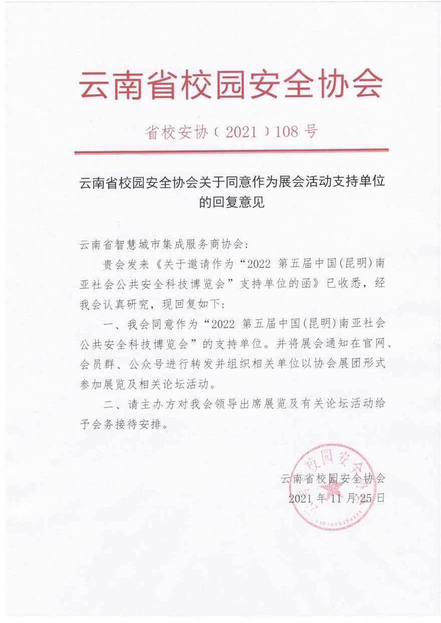 贵会发来《关于邀请作为“2022第五届中国(昆明)南亚社会公共安全科技博览会”支持单位的函》已收悉,经我会认真研究,现回复如下: