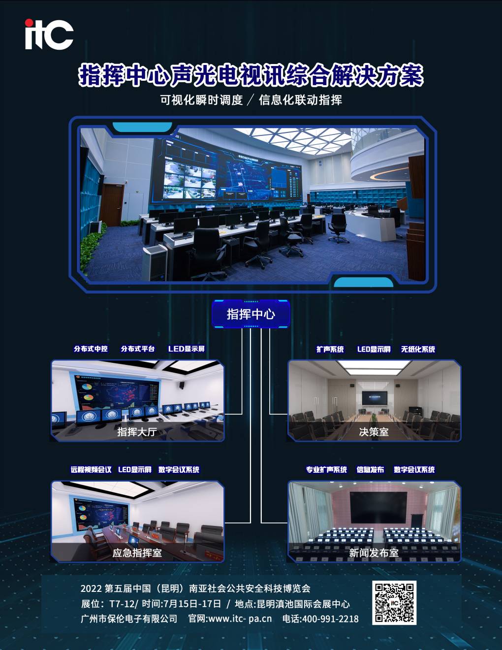 由云南省应急管理厅指导,云南省商务厅支持,昆明市商务局、云南省智慧城市集成服务商协会、云南省消防协会联合主办,云南万隆会展服务有限公司承办的2022第五届中国(昆明)南亚安博会将于7月15日-17日如期举办,广州市保伦电子有限公司itc将携新技术、新方案参加此次南亚安博会,热诚欢迎各位领导、专家和广大新老客户届时莅临展台(T7-12)指导,交流洽谈。