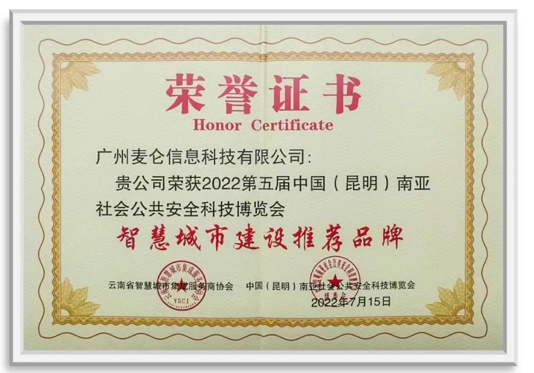 麦仑技术远超人脸识别、虹膜识别、指纹识别等传统技术,将成为未来的主流趋势。凭借着这一系列的技术优势,在此次展会上,麦仑就获得了2022第五届中国(昆明)南亚社会公共安全科技博览会“智慧城市建设推荐品牌”的荣誉,AI实力再获安防行业认可。